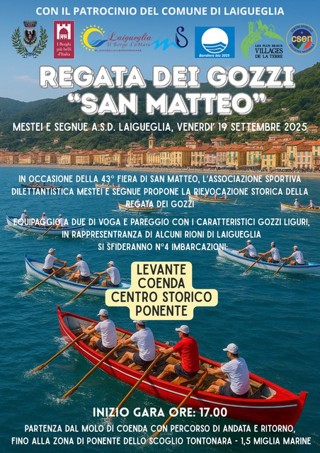 Organizzata da Mestei e Segnue A.S.D. Laigueglia, con il patrocinio del Comune, la regata fa parte della 43ª Festa di San Matteo e vuole riportare in vita l’anima autentica delle sfide tra gozzi, come si faceva una volta.