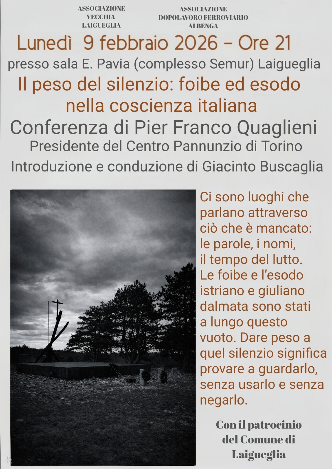 In occasione del Giorno del Ricordo, il Comune di Laigueglia ospita la conferenza “Il peso del silenzio: foibe ed esodo nella coscienza italiana”, in programma lunedì 9 febbraio alle ore 21 presso la Sala E. Pavia, nel complesso Semur.