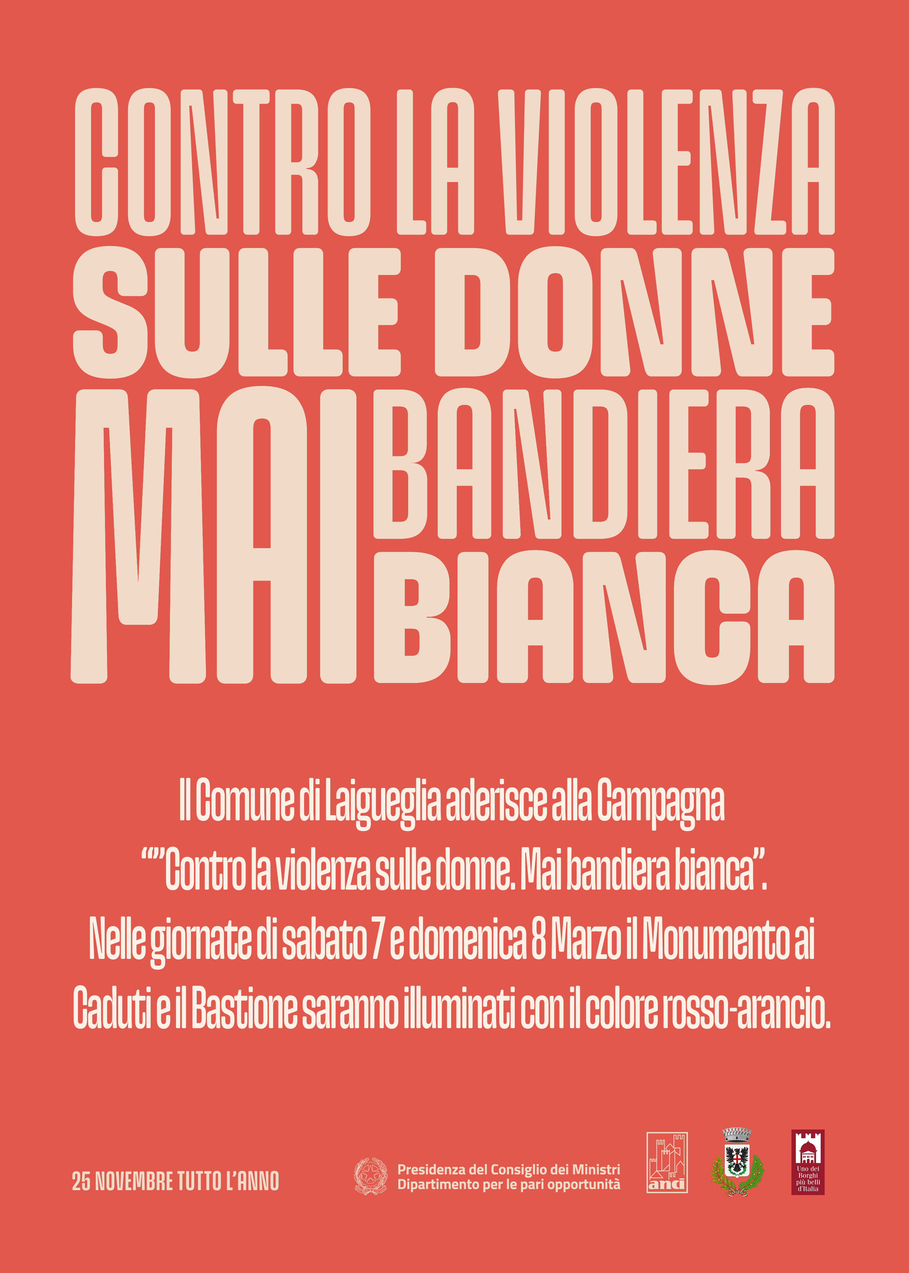 Il Comune di Laigueglia partecipa alla campagna nazionale promossa da ANCI “Contro la violenza sulle donne. Mai bandiera bianca”, un’iniziativa che coinvolge i Comuni italiani in un gesto simbolico e condiviso per sensibilizzare la cittadinanza su un tema che riguarda l’intera comunità.